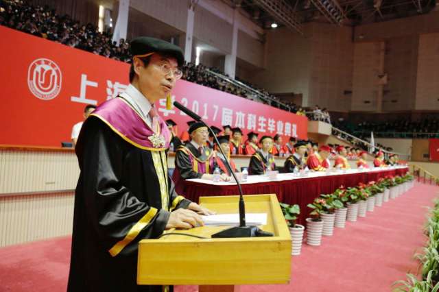 材料科学与工程学院91级校友杜立军先生作为校友代表发言。他用自己从母校毕业22年来的亲身经历讲述了上大人自强不息、求实创新的励志故事。 在校长授权各学院举行学位授予仪式的环节,金东寒校长逐一向各学院领导授权,由各学院组织学位授予仪式,全场师生一起见证这一属于毕业生们自己的荣耀时刻。 随后,全体毕业生在全场老师的监誓下庄严宣誓,将铭记“自强不息”、“先天下之忧而忧,后天下之乐而乐”的校训,履行时代赋予的使命,誓为祖国和人类的美好未来奋斗终身。
