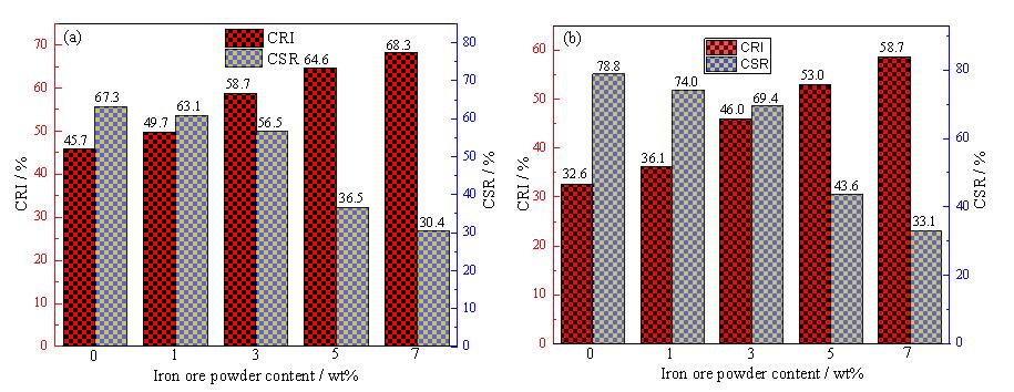 铁焦在不同气氛气化后的CRI与CSR (a) 40wt% H2O + 60wt% CO2and (b) 100% CO2