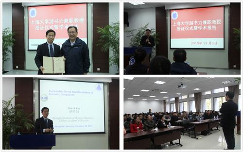 授证仪式结束后,游教授给师生们作了精彩的学术报告,报告题目为“Asymmetric Direct Transformations of Aromatic Compounds”,该报告为“今日化学”系列报告第150讲。报告对游教授课题组多年来取得的科研成果和创新进行了综述,解析了二茂铁的不对称C-H键官能团化反应,阐述了过渡金属尤其是金属铱催化下的芳香化合物和含氮杂环的去芳构化不对称反应研究、构建一系列具有生物活性的螺环、含氮杂环化合物的方法,通过丰富的科研成果、创新的反应方法和技术讲解,使在场的每一位师生领略到了化学的独特魅力和游教授热衷科学、努力钻研的可贵品质。报告后,游教授与老师和同学们进行了精彩的互动交流。会后,游书力教授与化学系领导及部分教师就科研工作和人才培养等方面进行了深入交流。