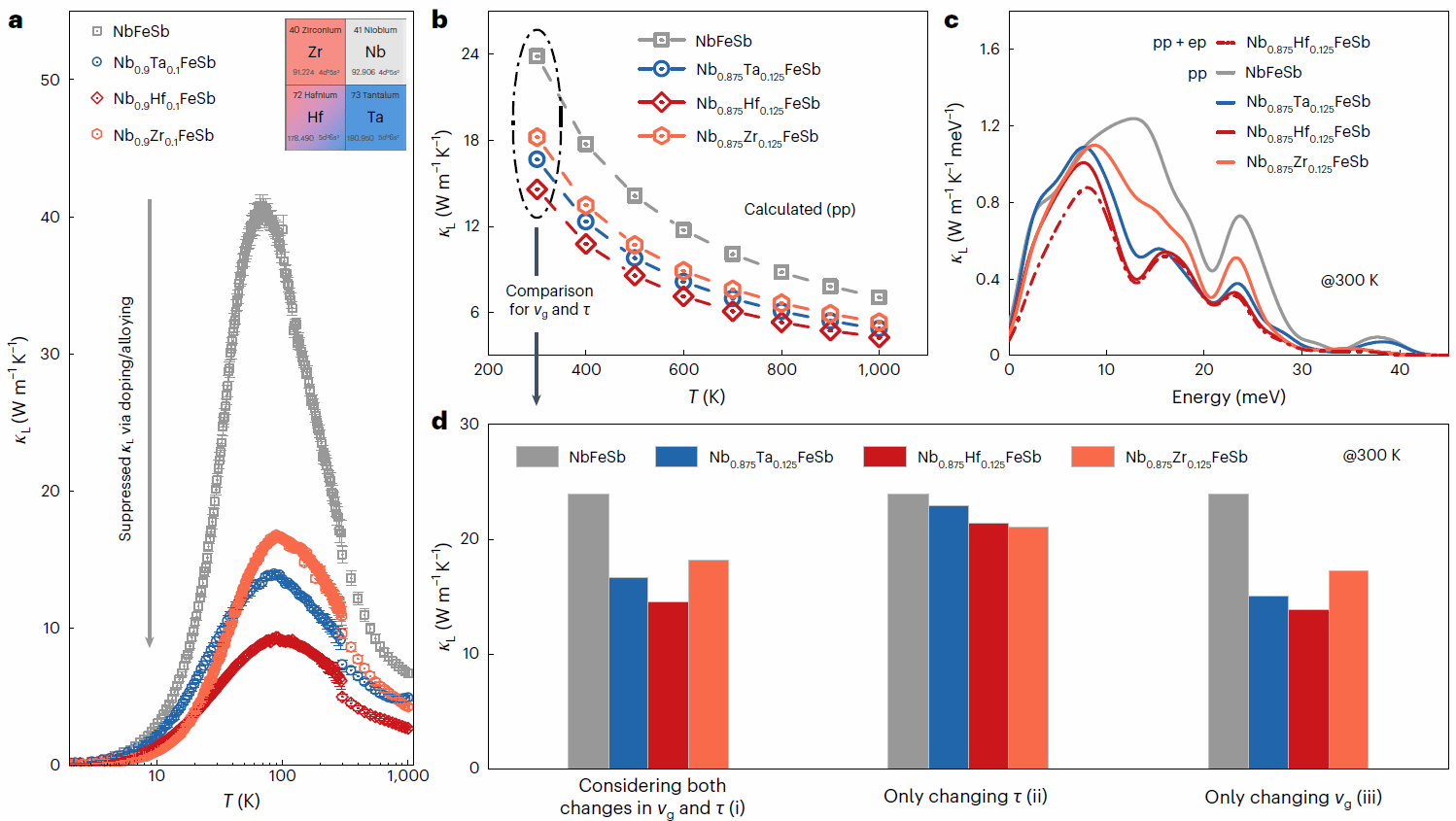 图1 异价掺杂/共电子合金化NbFeSb样品的晶格热导率对照
