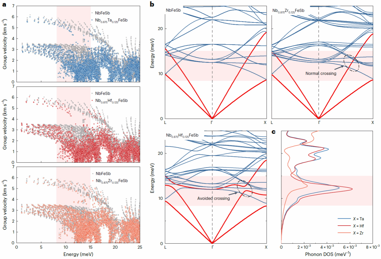 该成果以杨炯教授团队对掺杂体系的声子结构,热输运性能等第一性原理计算为重要分析手段,通过理论与实验相结合进行深入研究。以目前半赫斯勒合金中p型性能最优的NbFeSb基重带热电材料作为研究对象,将10%浓度的异价掺杂和共电子合金化的实验样品的全温度范围晶格热导率,与第一性原理计算的Nb0.875X0.125FeSb(X=Ti;Zr; Hf)结果进行交互对比分析,发现10%的异价掺杂在室温下实现的65%晶格热导率抑制主要源自异价掺杂带来的声子群速度的下降(图1)。通过非弹性中子散射技术对不同掺杂/合金化样品的声子态密度进行直接观测,发现异价掺杂引入显著的光学声子软化,且软化能量范围与理论计算吻合(图2)。除了带来光学声子软化之外,具有较重原子质量的Hf元素在较低声子能量范围还引起了声学声子和光学声子的“avoided crossing”效应(图3),导致声子色散关系发生变化,声子群速度显著下降,进一步抑制了材料的晶格热导率。