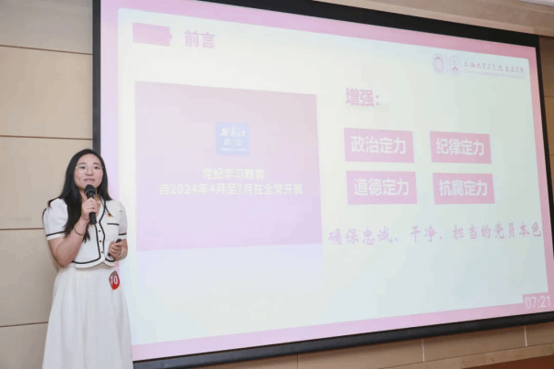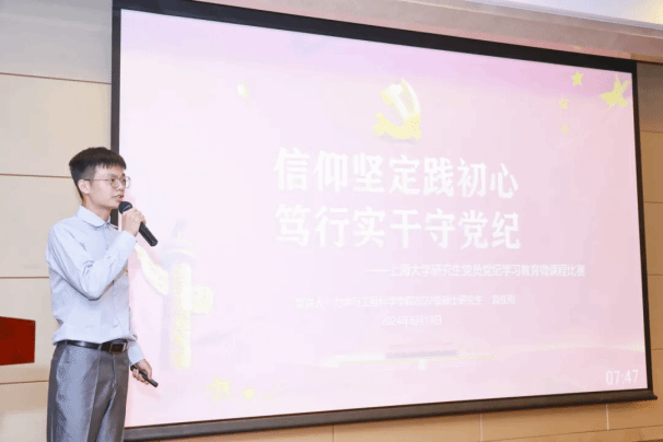 “科研领域不是党规党纪的真空地带,我们应注重科研诚信与党纪党规的统一,杜绝学术不端行为,确保科研真实性和公正性,树立优良学风。”材料科学与工程学院研究生党员柳亦晨以《“铁”打的纪律,“刚”筑的底线》为题,以“铁”和“钢”形象比喻研究生们在工作和生活中所需遵循的严格纪律和坚定底线。未来技术学院研究生党员黄宇腾通过“汉芯一号”芯片伪造、论文学术造假等科研领域的实际案例,强调“任何一个微小的信息泄露,都可能对国家的安全和利益造成不可估量的损失。”