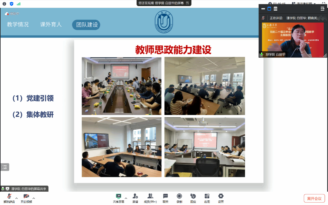 理学院“大学物理”课程负责人、上海学校课程思政示范课程暨示范团队负责人白丽华副教授,就党的二十届三中全会精神在“大学物理”教学中的融入作了交流发言。围绕着以生为本、因材施教,注重学科前沿引领,增加课程的挑战性,课外指导学生参加学科竞赛,培养学生创新能力,涵养学生科技报国的家国情怀和勇攀高峰的科学精神。通过集体备课、示范公开课等方式提升团队教师的教书育人能力。